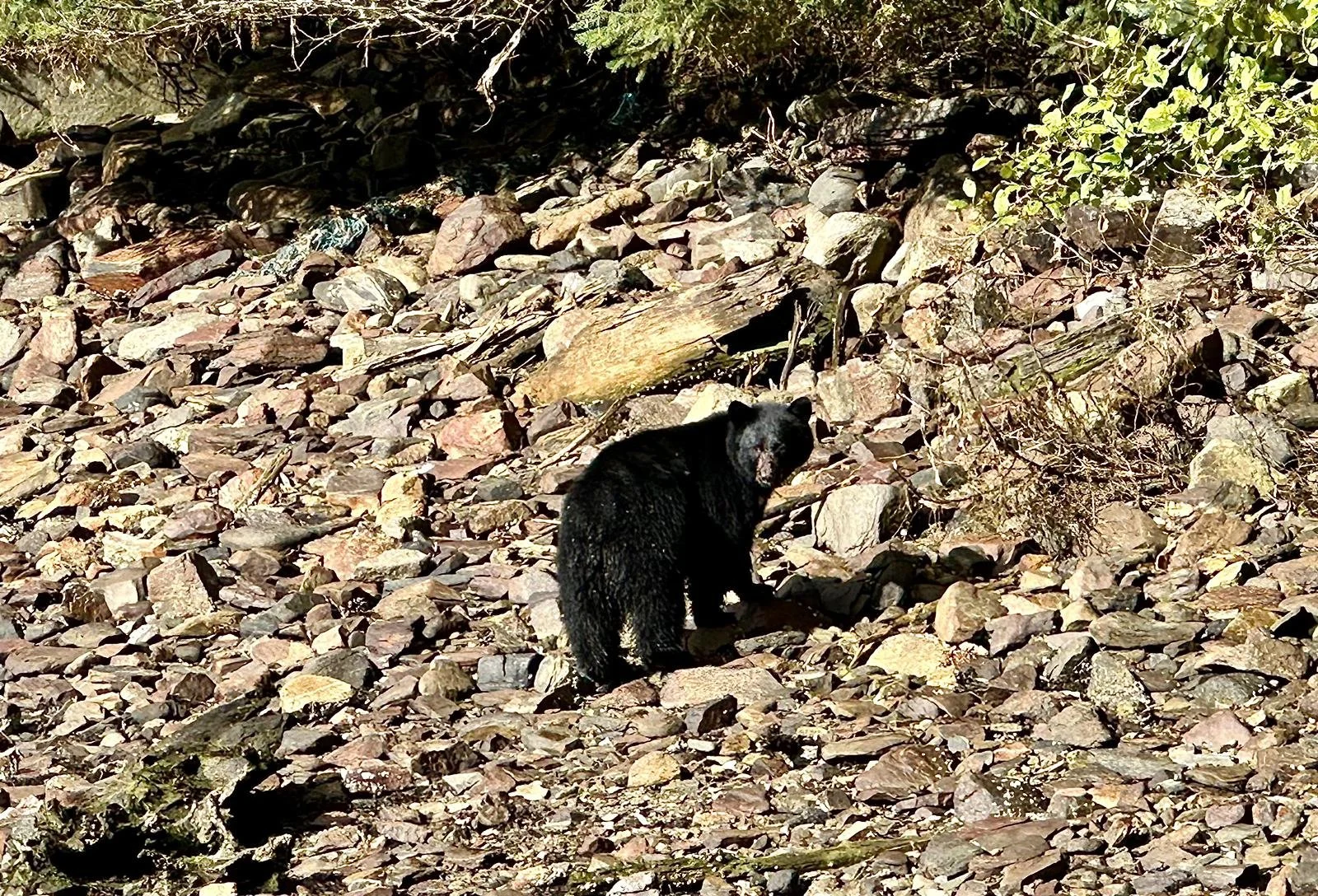 Today, however, the bears seemed to be hiding behind the bushes. We spent a good length of time at the observation point, scanning the landscape for activity. Just as our time was up and we began heading back to the boat, we spotted a bear on the stony beach, which was an exciting way to end our time at Neets Bay.