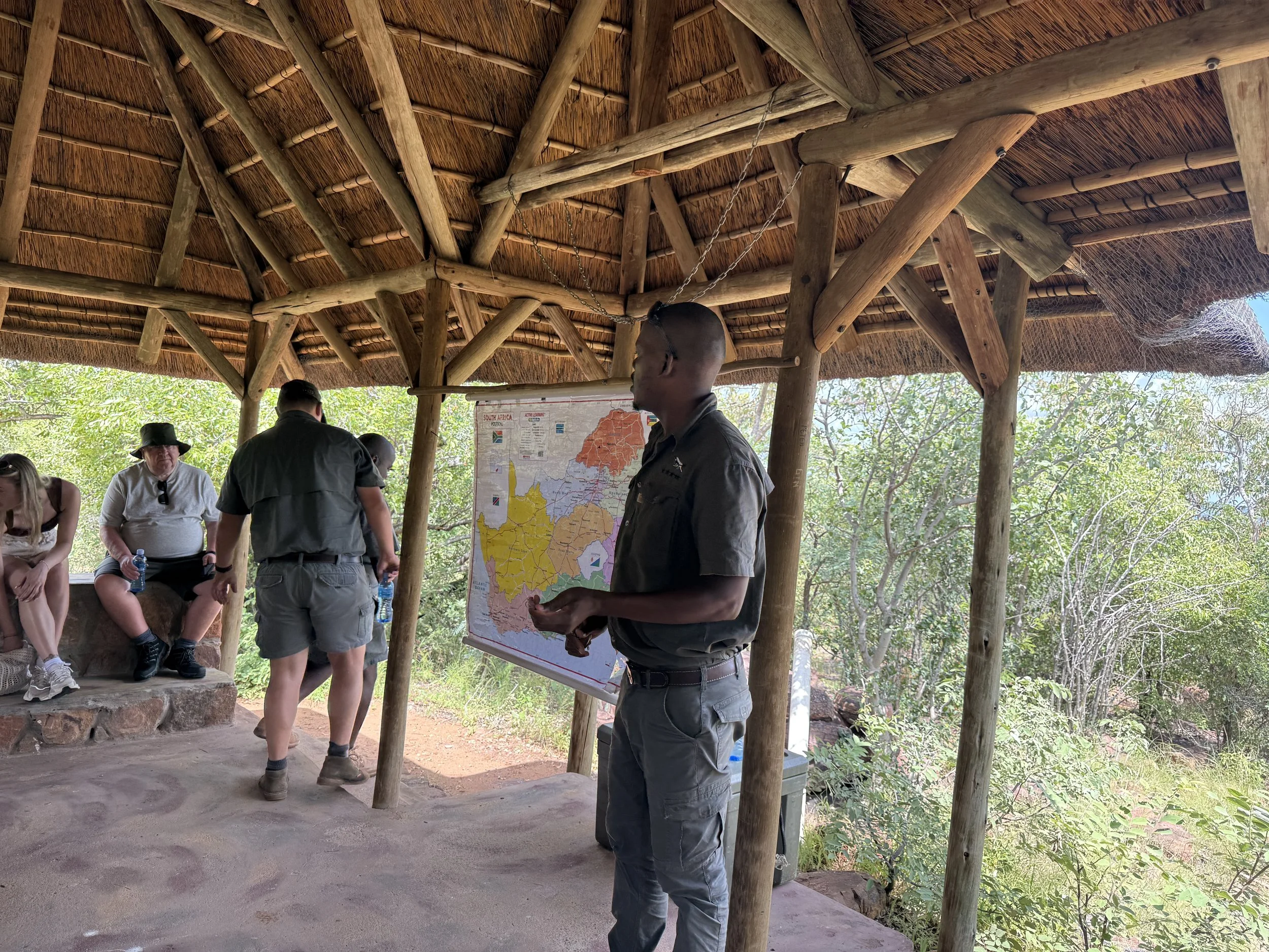 After breakfast, we gathered around for a briefing from our game drivers. Once everyone had selected their jeeps, we headed into the bush to a special spot where our guides gave us an insightful wildlife talk. They explained what to expect on the game drives, shared details about optional excursions, and introduced us to some of the species of animals, birds, and plants we might encounter during our stay.