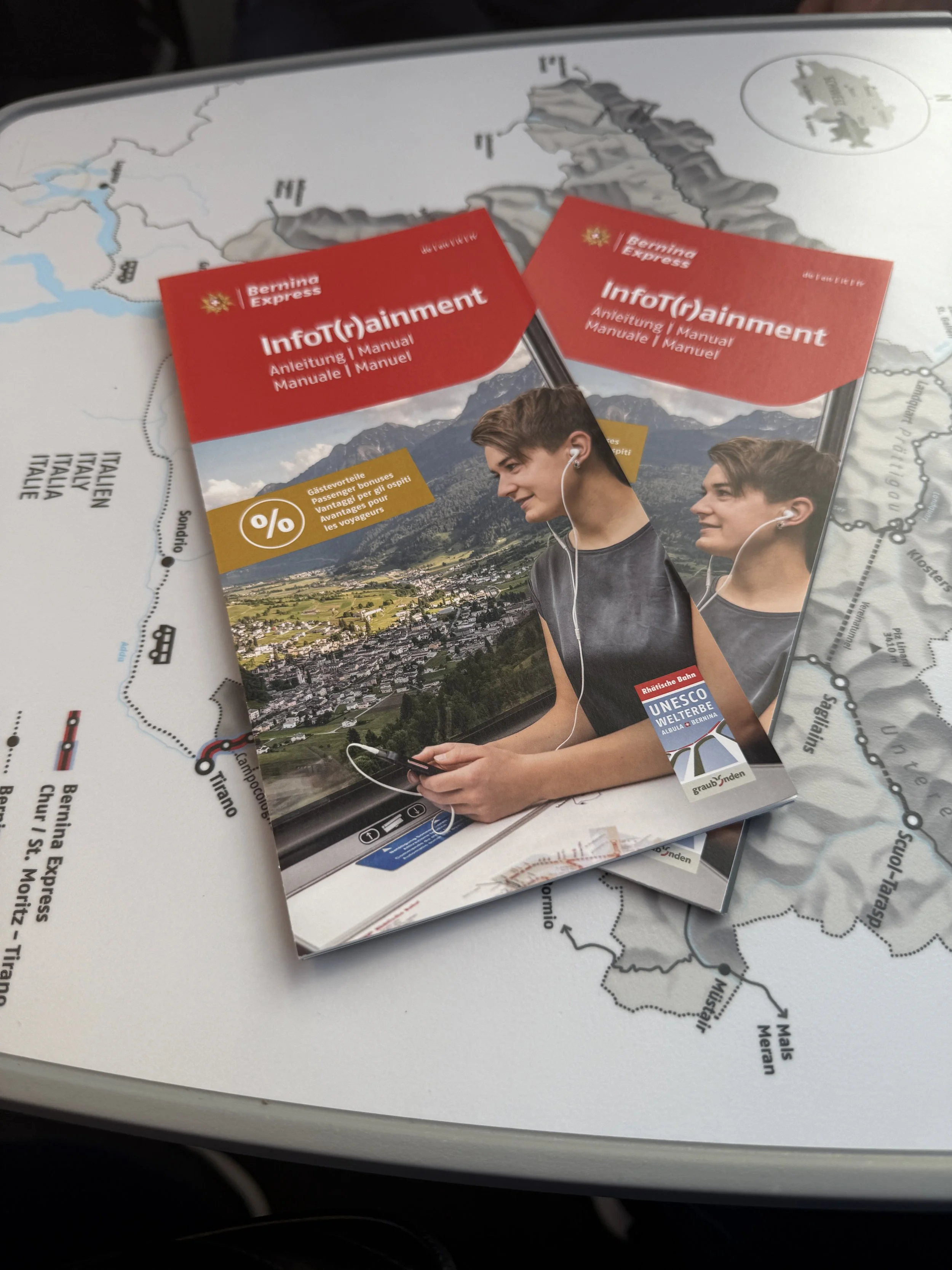 Drinks and light snacks were offered during the ride (at an additional charge), but first-class passengers also received a complimentary chilled tea in a carton and a metal tin shaped like the Bernina Express filled with Lindt chocolates. That sweet treat absolutely hit the spot and made the moment even more special!
